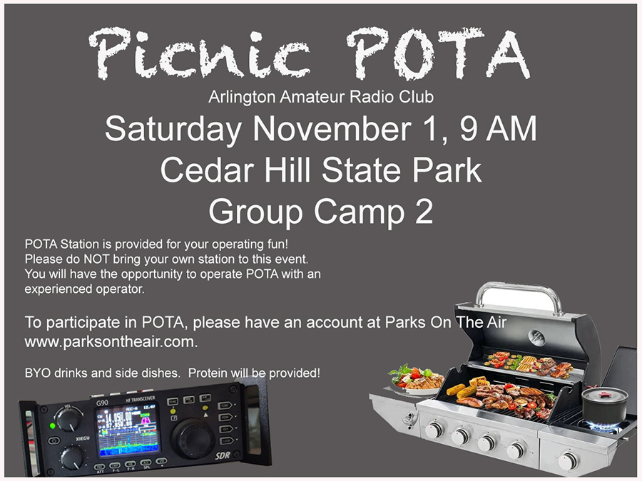 November MeetingThe November meeting will be at the Arlington Public Library on Thursday Nov 13, 2025. We will have Board Member elections this month! More info to follow... Dining OutOn the Saturday after the club meeting, at 5pm, we have a club dinner at various local restaurants. Please join us for some food and socializing! Saturday, November 15, 2025 5pm David’s Barbeque 2224 W Park Row Dr h, Pantego, TX 76013 Taco Tuesday NetThe Arlington Amateur Radio Club will have our Taco Tuesday net on our 2 meter repeater. The net is every Tuesday at 7:00 PM. Our repeater is at 147.140 Mhz with a pl tone of 110.9. The net is open to all, members and non-members alike. Hope to see you there! Have you renewed your membership?If you haven't paid your 2025 dues don't forget. It's easy to do right here on our site... Membership dues are payable as of January 1, 2025. Check the "Pay Dues" tab and please make sure your email address is current with the club. CERT Basic TrainingThe Arlington Fire Department will be offering Community Emergency Response Team (CERT) training twice this year. The dates are listed in the calendar. You can visit the Fire Department page for more info at CERT Donation ButtonThere is now a Donation Button on the Pay Dues page, located at the bottom of the page. |